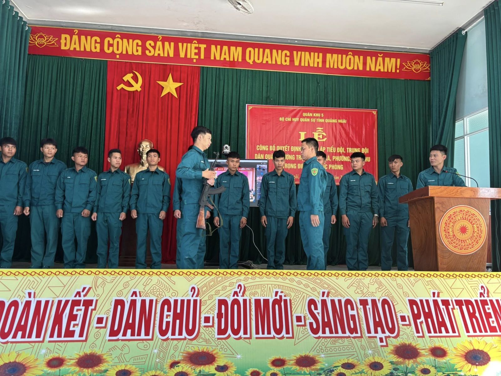 Chiều ngày 30/12/2025, Bộ Chỉ huy Quân sự tỉnh Quảng Ngãi tổ chức Lễ công bố Quyết định thành lập tiểu đội, trung đội Dân quân Thường trực của 85 xã, phường, đặc khu trọng điểm về quốc phòng trên địa bàn tỉnh. Buổi lễ được tổ chức theo hình thức trực tuyến, kết nối từ điểm cầu cấp tỉnh đến các địa phương.