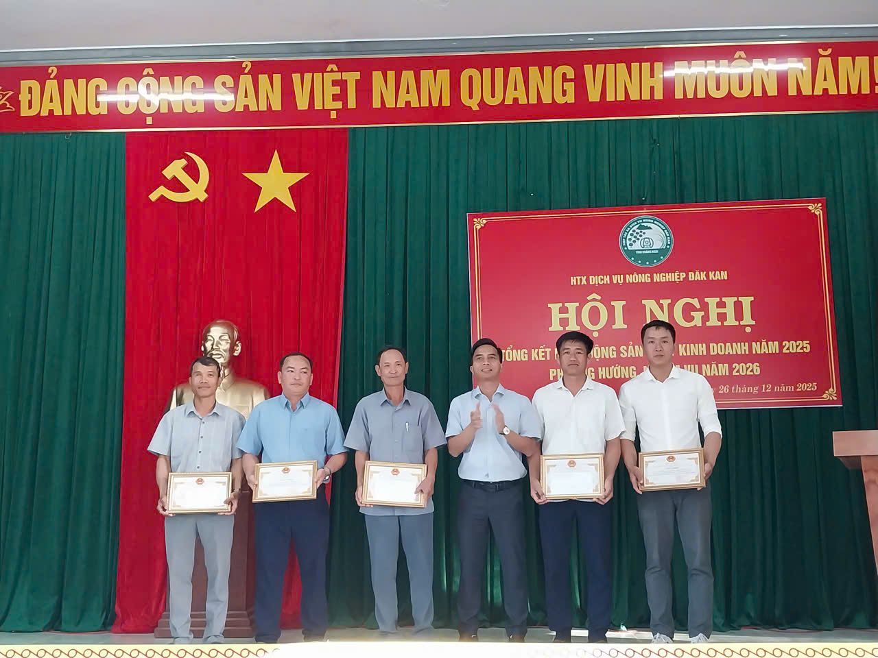 Nhân dịp này, Chủ tịch UBND xã đã khen thưởng 01 tập thể và 07 cá nhân có thành tích tiêu biểu; Giám đốc HTX khen thưởng 26 cá nhân có thành tích xuất sắc trong phong trào thi đua năm 2025. Hội nghị diễn ra trong không khí nghiêm túc, đoàn kết và quyết tâm, tạo động lực để HTX DVNN Đăk Kan tiếp tục phấn đấu hoàn thành tốt nhiệm vụ trong năm 2026 và những năm tiếp theo.