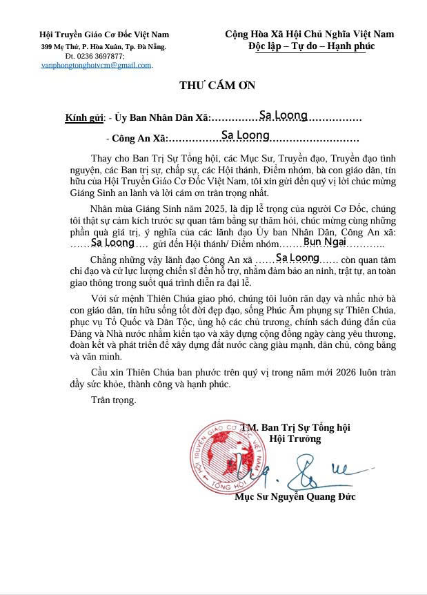 Ngày 28/12/2025, thay mặt Ban Trị sự Tổng hội Hội Truyền giáo Cơ đốc Việt Nam, Mục sư Nguyễn Quang Đức gửi Thư cảm ơn đến lãnh đạo UBND xã Sa Loong và Công an xã Sa Loong.